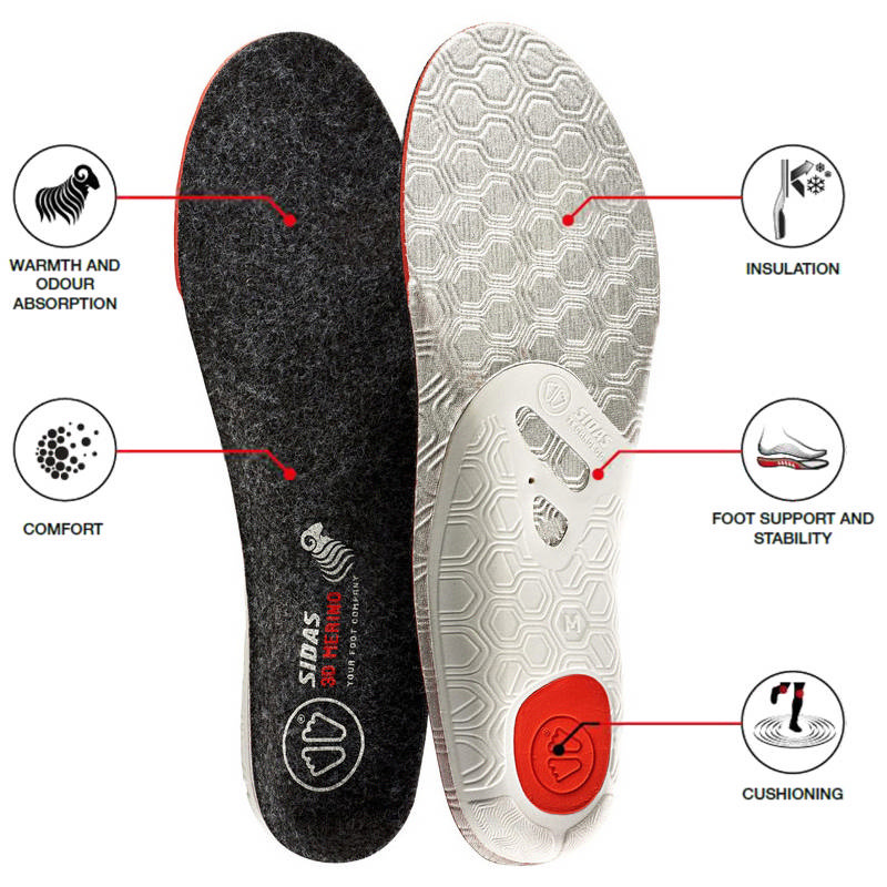 Anatomický 3D tvar udržuje nohy ve správném postavení. Izolační ALU-folie v kombinaci s merino vlnou zabraňuje pronikání chladu a úniku tepla a aktivně omezuje pachy. EVA materiál pod patou absorbuje nárazy.