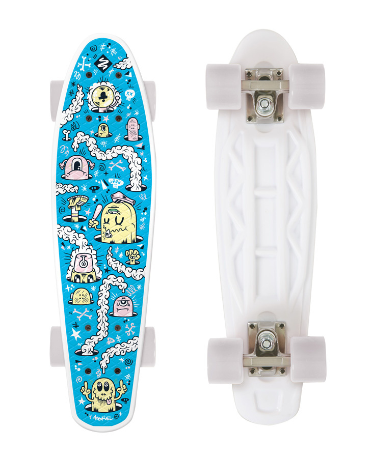Odlehčený dětský plastový skateboard s jedinečným designem od umělce Adda Fuela. Stvořen pro zábavu a pohodlné přenášení. Vyndej ho z batohu a jeď