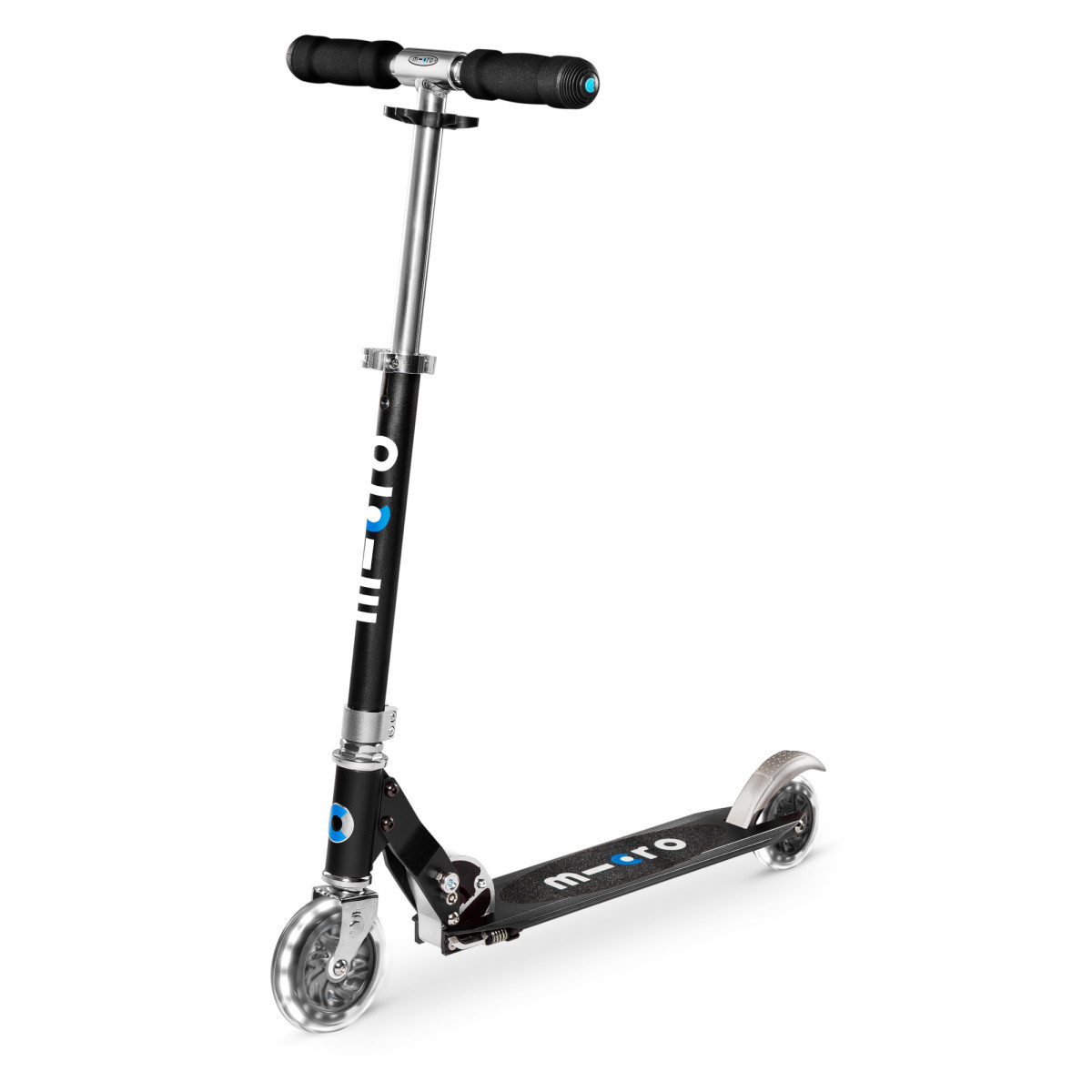 Dětská skládací koloběžka Sprite Black s LED kolečky. koloběžka je v černé barvě a nabízí dobře ovladatelnou, lehkou a bezpečnou konstrukci s nízko posazenou deskou pro snadný odraz.