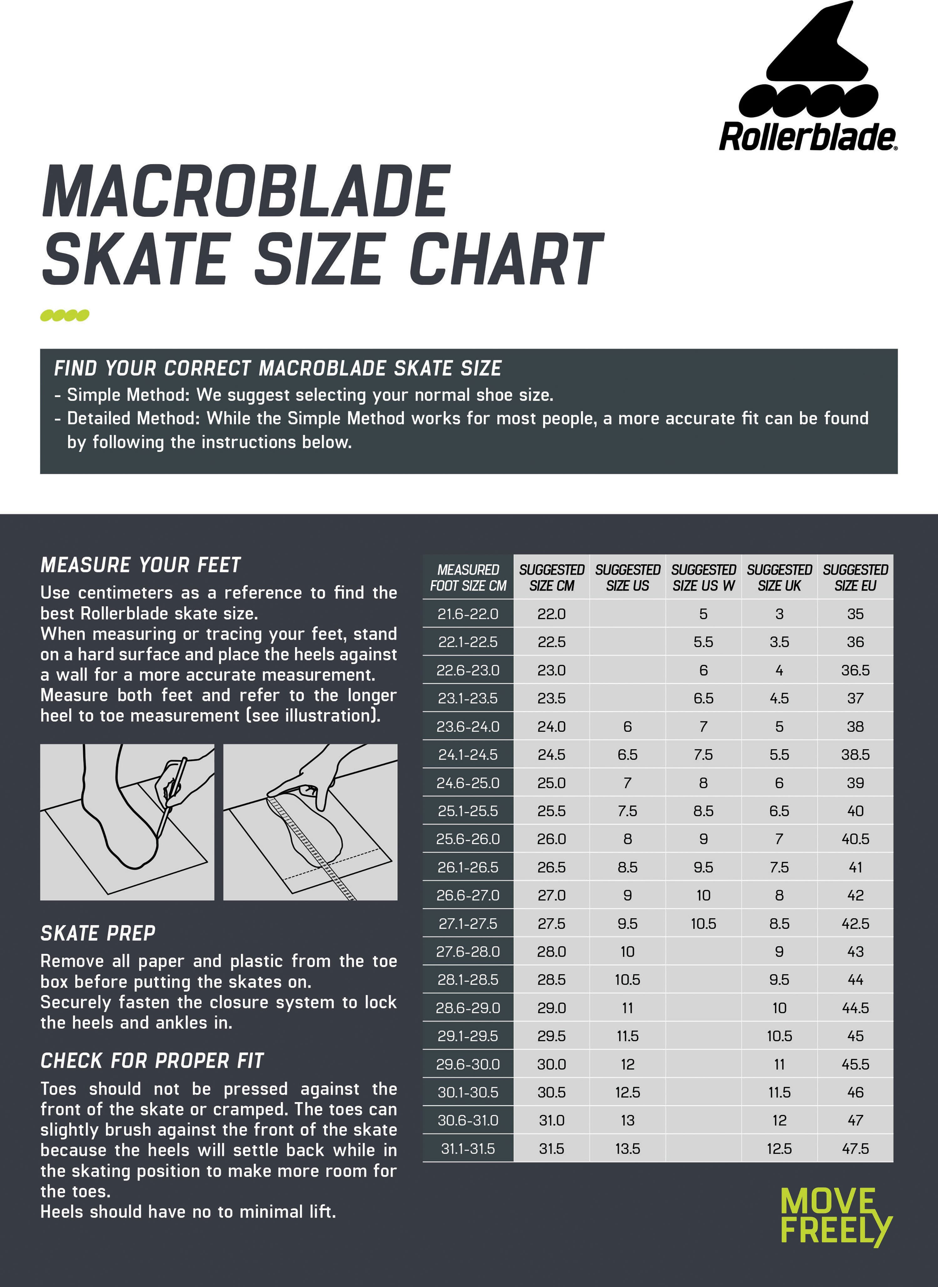 Tabulka velikostí Rollerblade slouží ke snazšímu výběru správné velikosti kolečkových bruslí Rollerblade. Velikosti se mohou u různých výrobců lišit, proto je nejvýhodnější řídit se velikostí mondopoint v cm. Změřte délku vašeho chodidla v cm. Přiložte chodidlo patou těsně ke stěně a změřte vzdálenost od stěny ke špičce palce. Můžete dát pod chodidlo ke stěně také papír, obkreslit nejdelší místo chodidla tužkou a poté změřit velikost. Vždy změřte obě nohy, jedna noha může být větší. Pro nalezení správné velikosti poměřte naměřené údaje s níže uvedenou tabulkou velikostí. Tabulka velikostí nemusí být platná pro všechny modely Rollerblade, některé modely se mohou lišit, doporučujeme zkontrolovat tabulku velikostí u každého modelu.