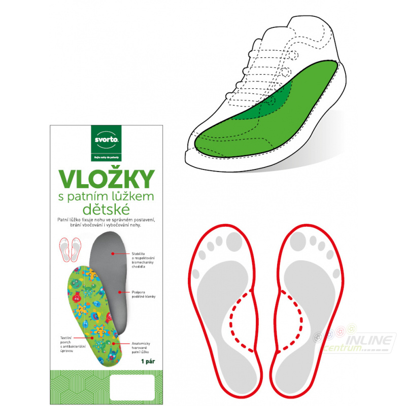 vložky Svorto s patním lůžkem jsou určeny především do obuvi, která není vybavena jinou ortopedickou nebo zdravotní vložkou nebo svými vlastnostmi nesplňuje požadavky na dětskou zdravotně nezávadnou obuv. Pružný a pevný materiál EVAC tvoří lehkou vložku s dlouhou životností a jednoduchou údržbou při současném zajištění dostatečné stability a respektování biomechaniky chodidla. vložky vyrovnávají chodidla do správného postavení - podporují podélnou klenbu a stabilizují patu. Patní lůžko a podélná klenba drží nohu ve správném osovém postavení.
