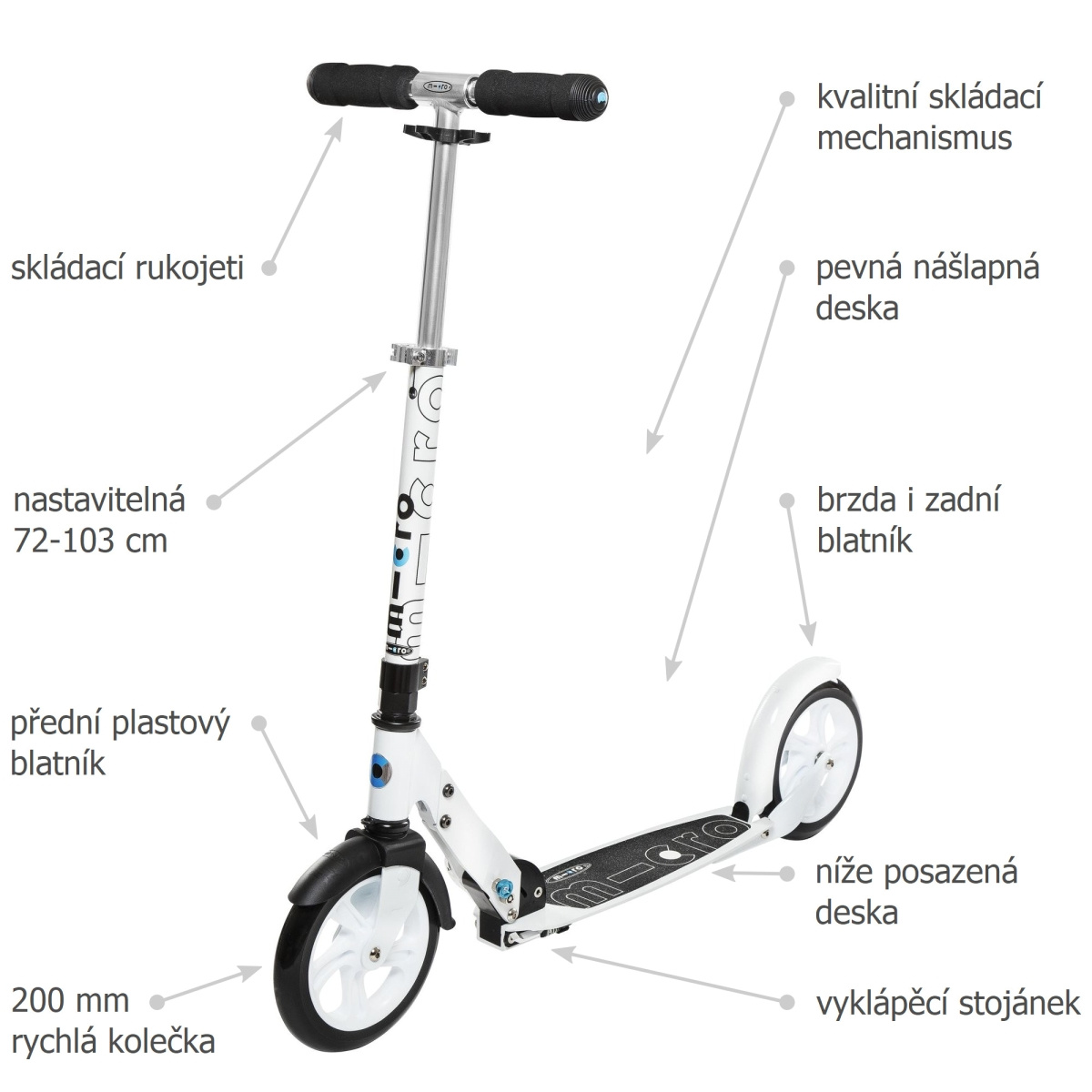 Skládací koloběžka Micro White představuje esteticky laděnou a vysoce elegantní skládací koloběžku pro maximální jízdní zážitek. Hlavními přednostmi této koloběžky jsou kolečka o velikosti 200 mm určená pro svižnou jízdu, pevná nášlapná deska a skládací řídítka.