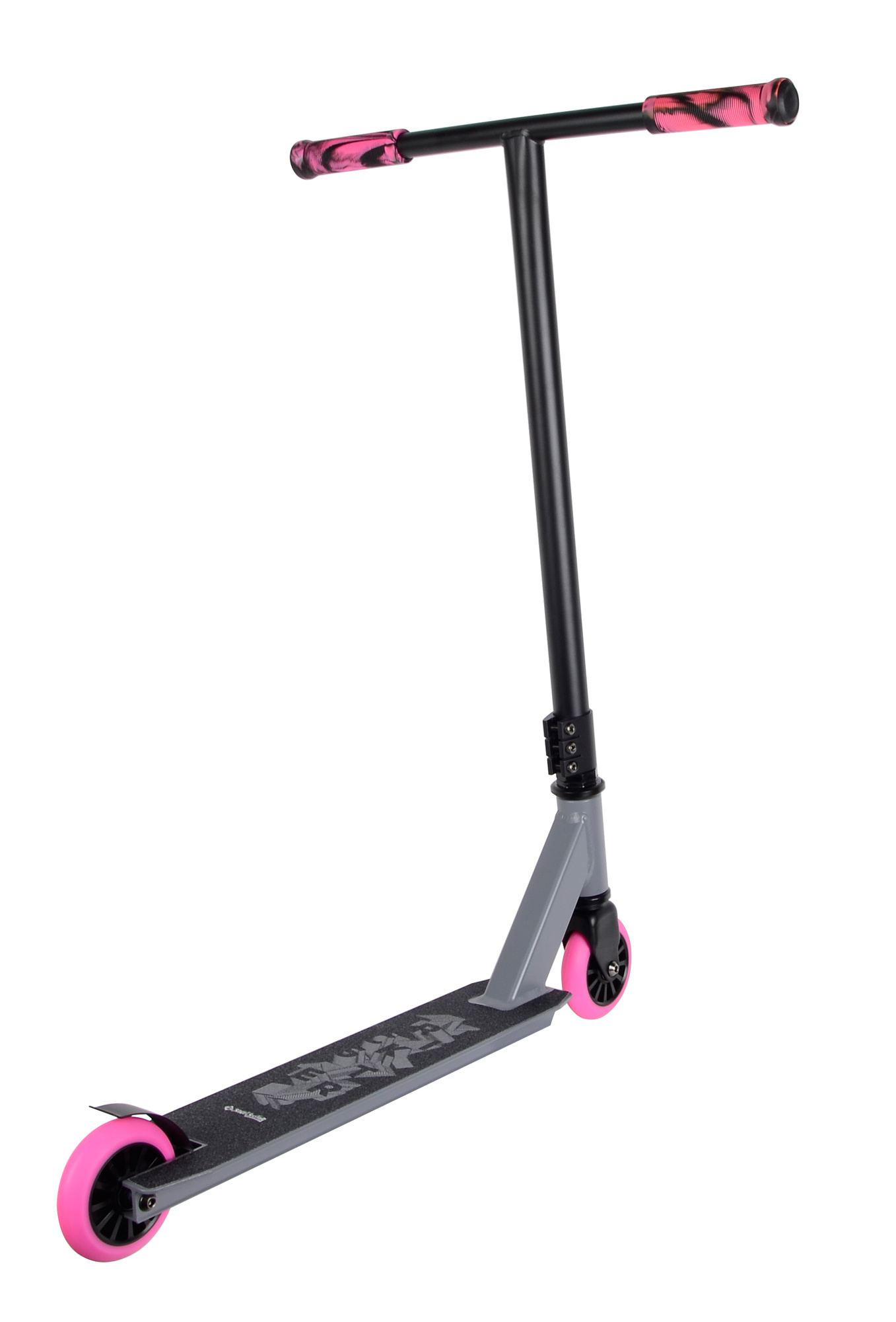 Na této atraktivní a cenově dostupné koloběžce si mohou začátečníci vyzkoušet své první skoky a triky. Konstrukce vyniká svařovanými T řídítky, ocelovou vidlicí, vyztuženou svařovanou hliníkovou deskou a tříbodovou objímkou.
