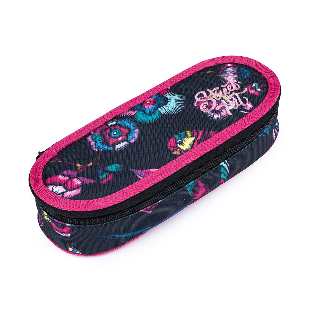Oválný penál pro všechny potřebnosti. Uvnitř pouzdra je síťová kapsička na zip a klopa, na níž jsou umístěny gumičky pro uchycení celkem devíti tužek a propisek, které je potřeba mít přehledně uspořádané a po ruce. Volný prostor pod klopou pak umožňuje volně umístit další psací potřeby – pastelky, fixy, prostě cokoliv potřebujete.