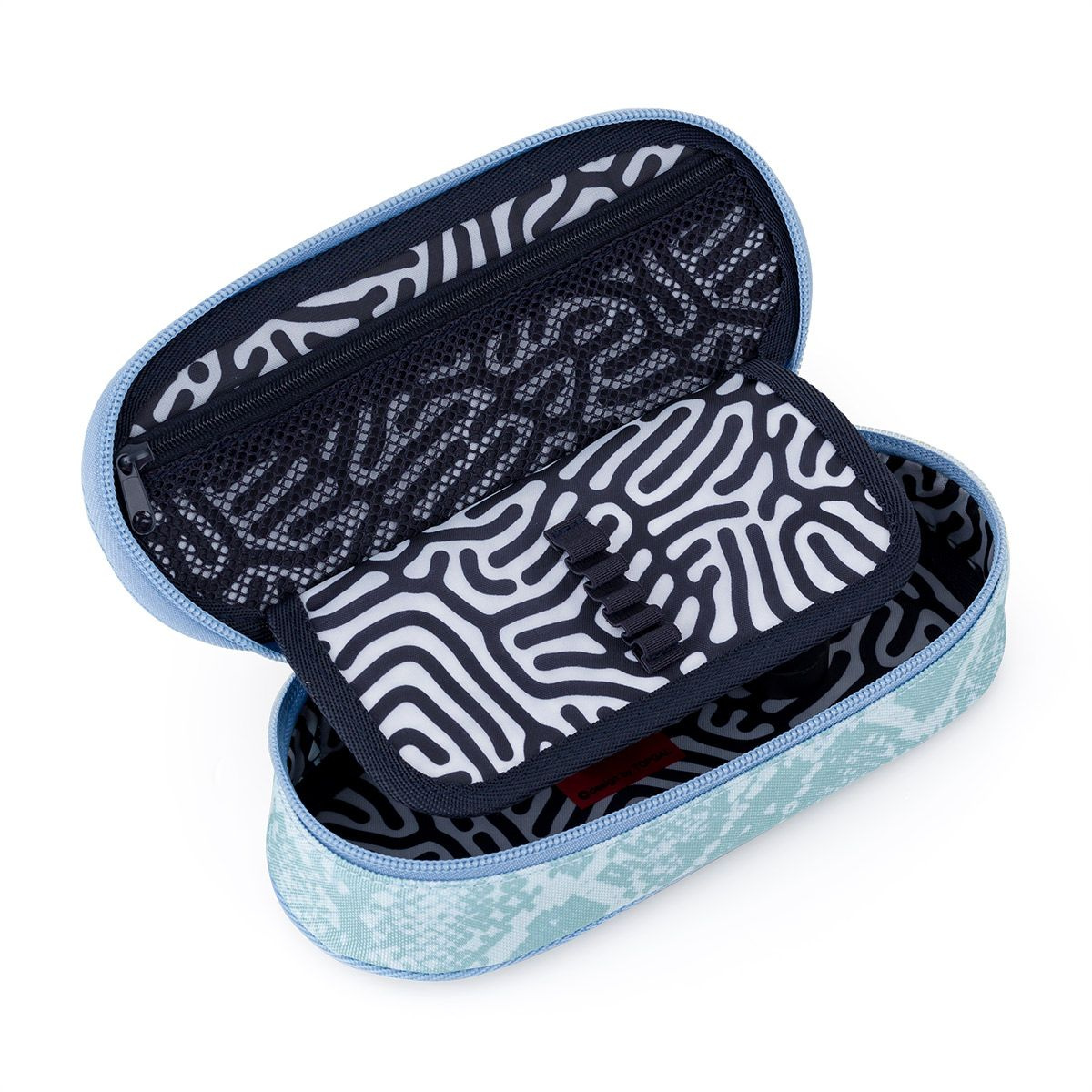 Oválný penál pro všechny starší školáky a studenty. Uvnitř pouzdra je síťová kapsička na zip a klopa s devíti gumičkami na propisky. Volný prostor pod klopou slouží pro další psací potřeby – pastelky, fixy, ale i pravítko nebo kružítko.