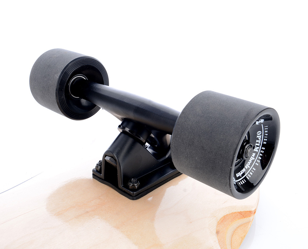 Podvozek je vybaven reversed 6" trucky s matnou povrchovou úpravou, které umožňují precizní zatáčení a hladkou jízdu. Bushingy z SHR 88A zaručují vynikající tlumení nárazů, zatímco měkké 3 mm gumové riser pady přidávají extra komfort a snižují vibrace.