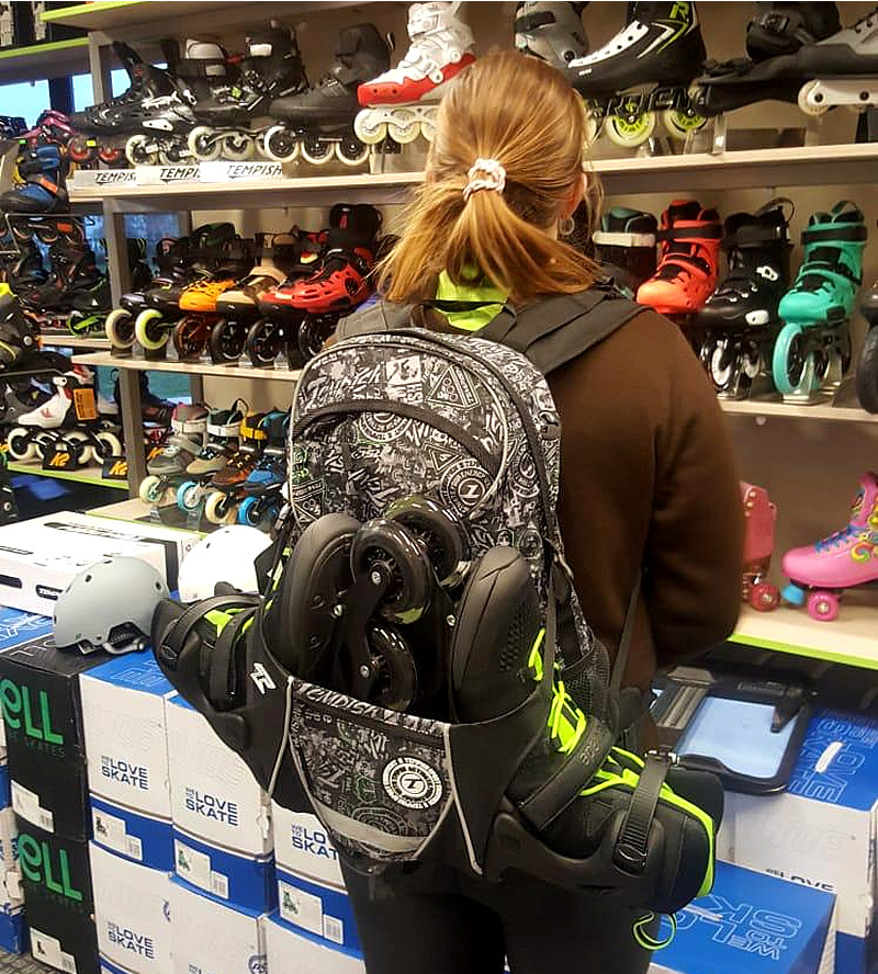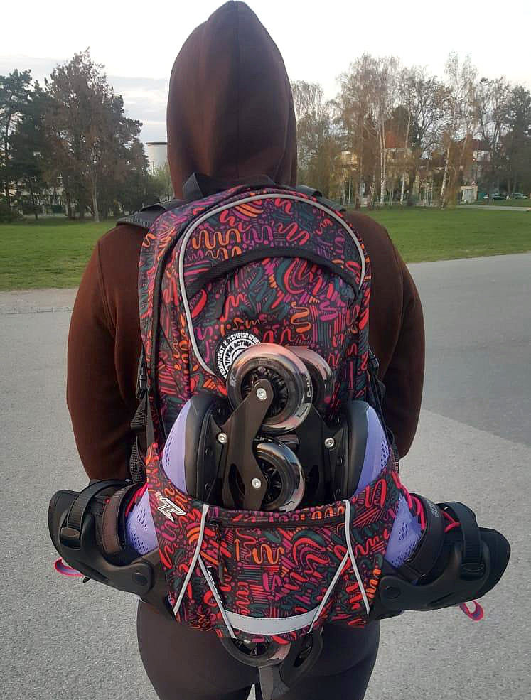 Multifunkční batoh DIXI je vybaven speciálními úchyty pro připevnění kolečkových bruslí z venku, čímž je zamezeno ušpinění vnitřního prostoru a zde uložených věcí.