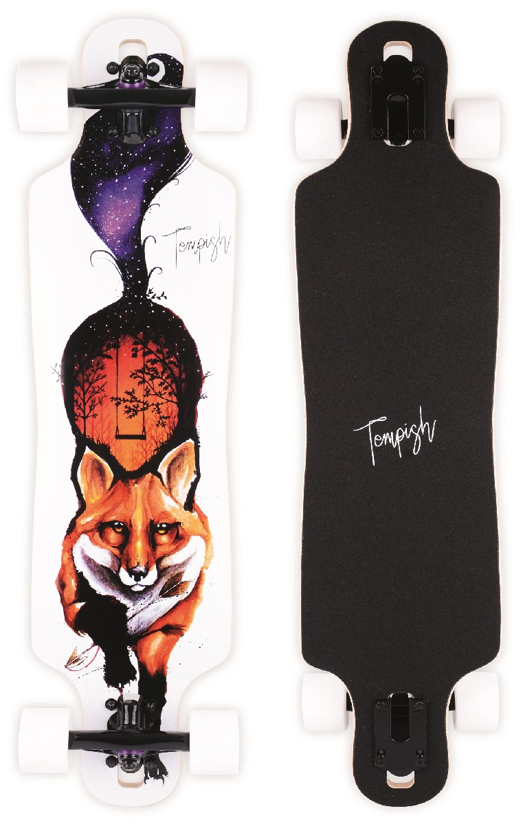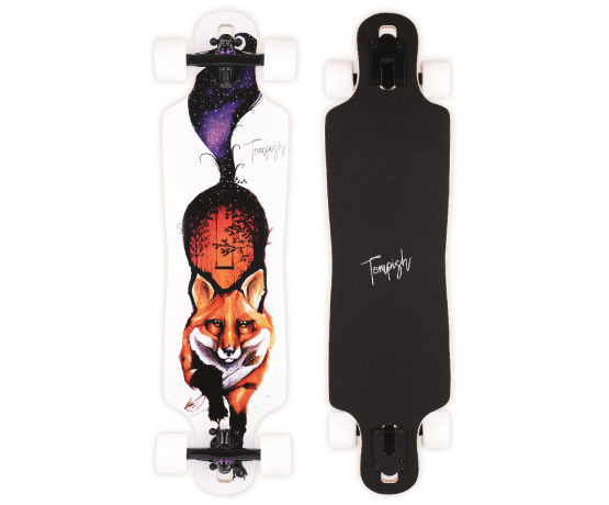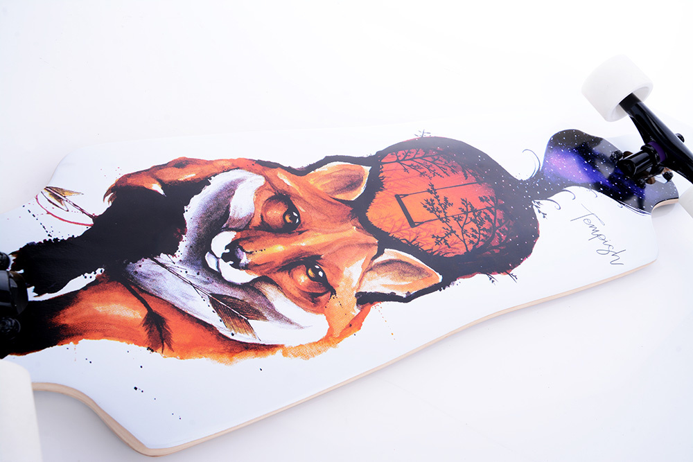 Odolná deska je vyrobena z 8 vrstev javoru. Díky konstrukci Drop through je deska posazena blíže k zemi a longboard je tak stabilnější. Deska má kompatkní rozměry 32x8,5"(82,5 x 21,6 cm). Díky tomu se snadno přenáší.