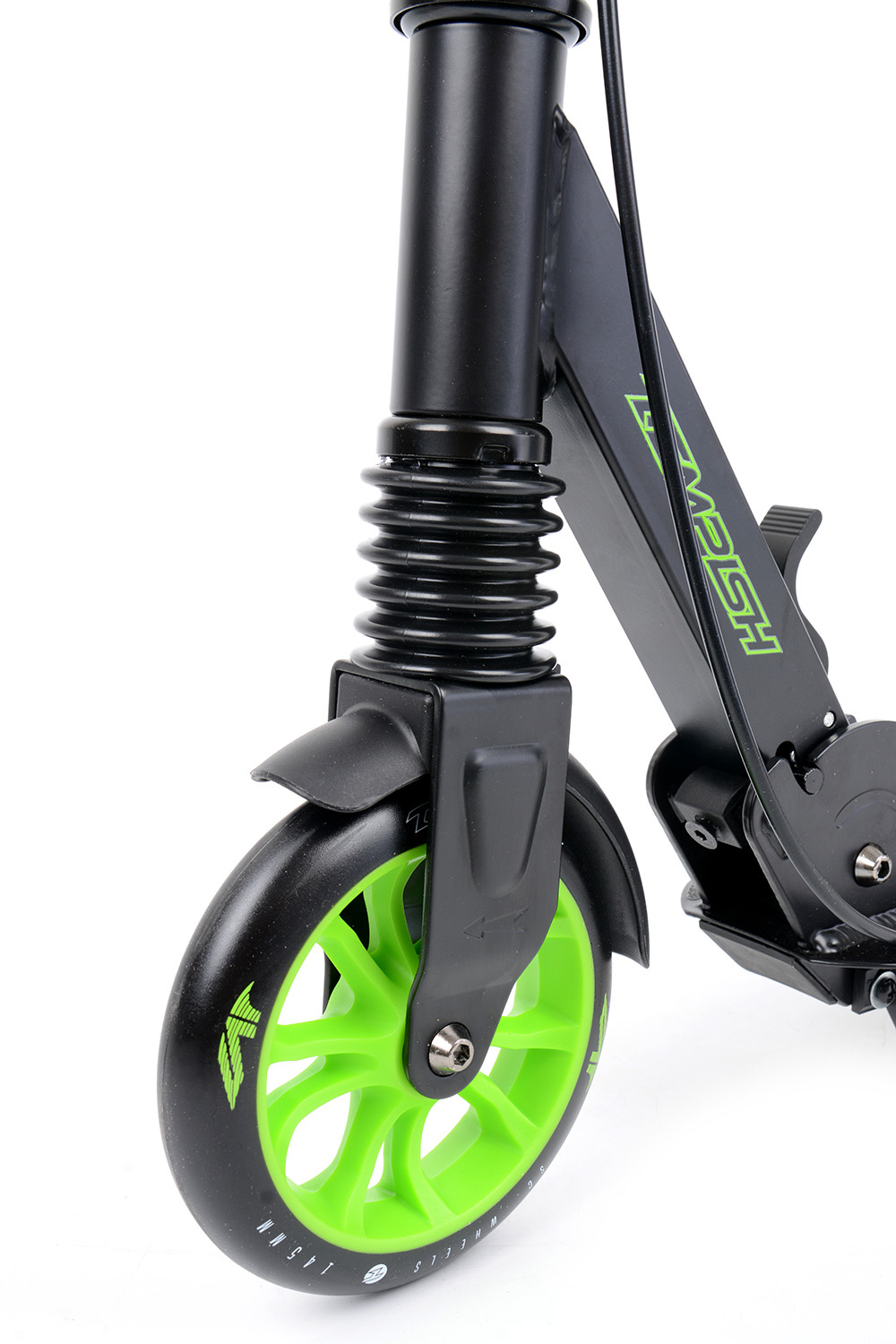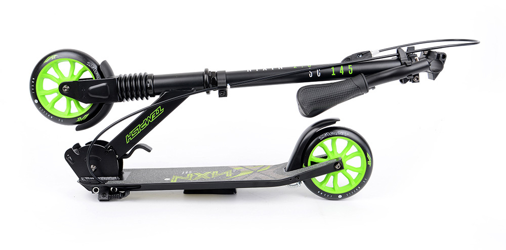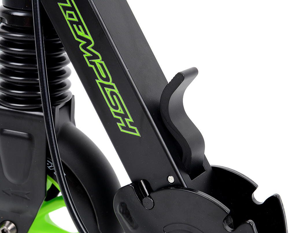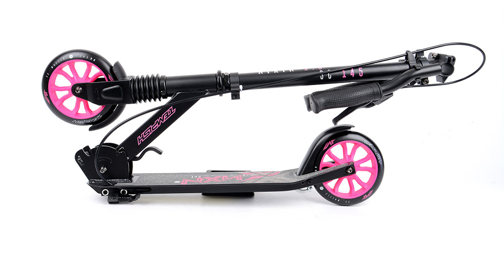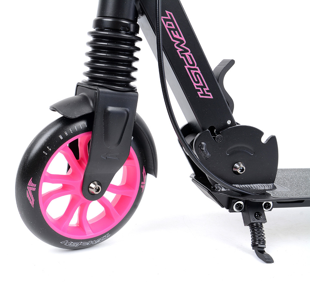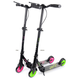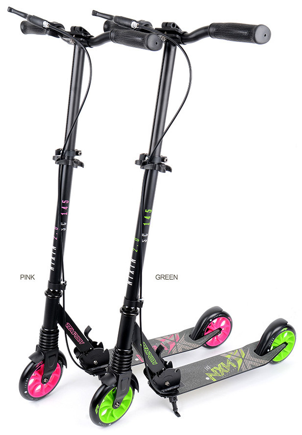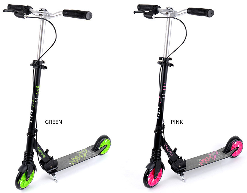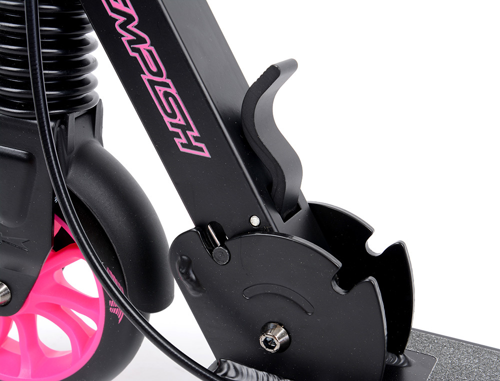 Dětská skládací koloběžka se zadní blatníkovou brzdou. koloběžka je lehká, snadno přenosná. Snížená úroveň stupátka nad povrchem. Hlavové složení se závitem. koloběžka je vybavena stojánkem, odpružením předního kola, anatomicky polohovatelnými řídítky a brzdovou páčkou pro zadní kolo. Řídítka jsou opatřena objímkou pro zmírnění otřesů.