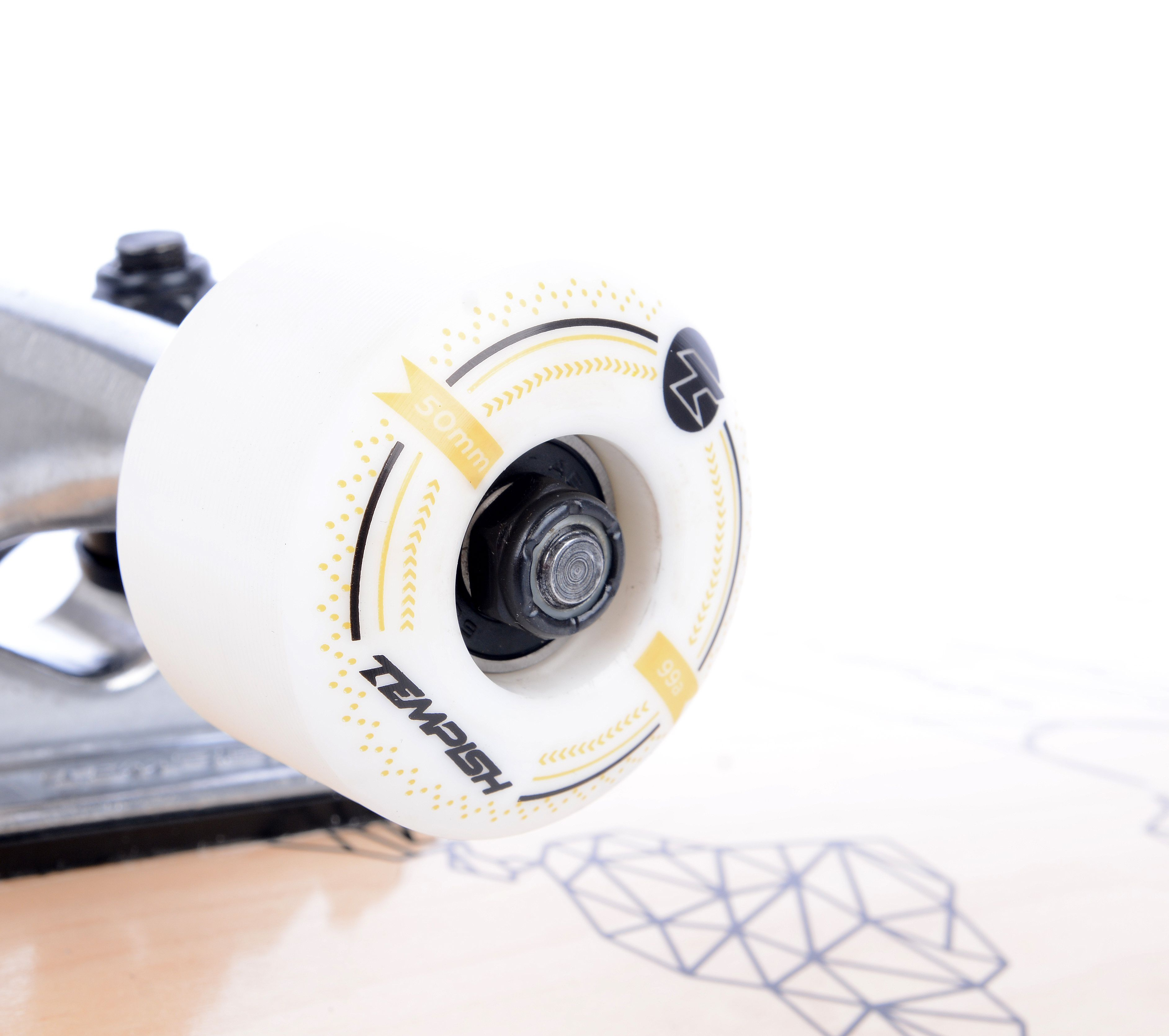 skateboard je osazen kolečky v bílé barvě s decentním potiskem. kolečka s tvrdostí 99 A jsou rychlá, odolná a hodí se na hladší povrchy. kolečka o průměru 50 mm a šířce 36 mm jsou vhodná i pro technickou jízdu a triky. Díky nižšímu posazení je skateboard velice stabilní a dobře ovladatelný.