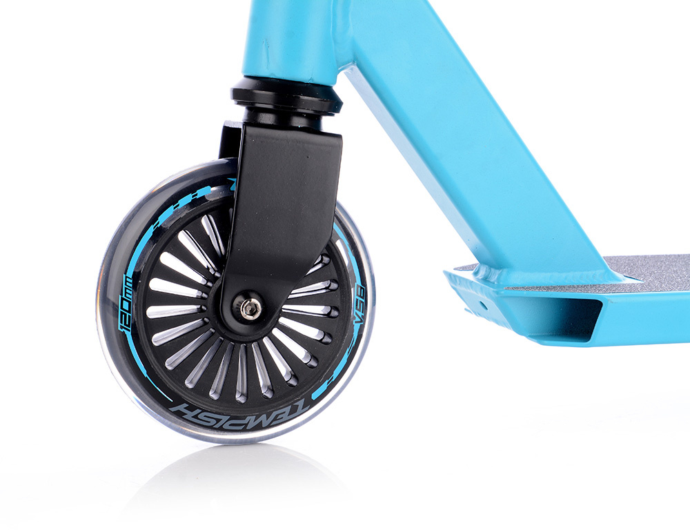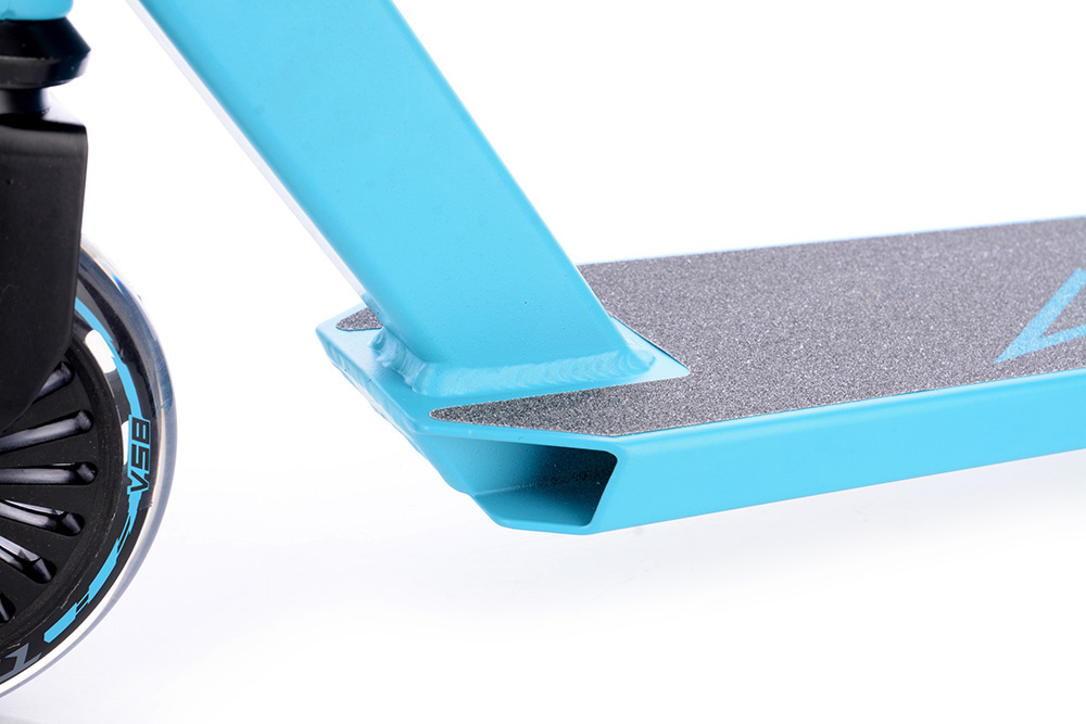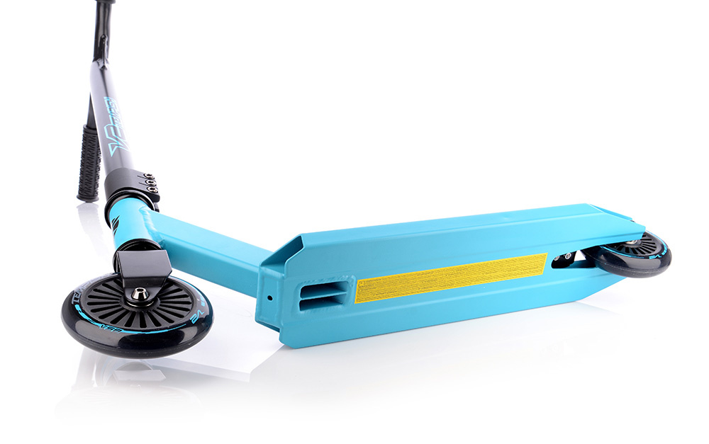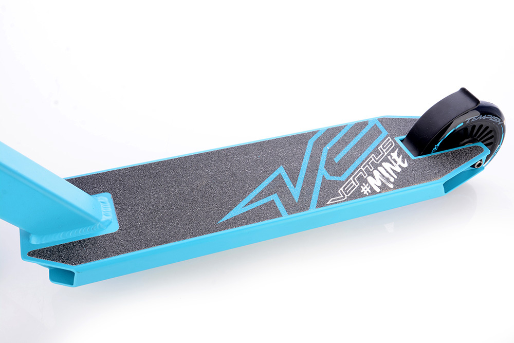 koloběžka VENTUS MINE II je určená k freestylu, je osazena vpředu 120 mm kolečkem, vzadu kolečkem o průměru 100 mm, tvrdost 85A. Oproti předchůdci má vylepšenou konstrukci desky.