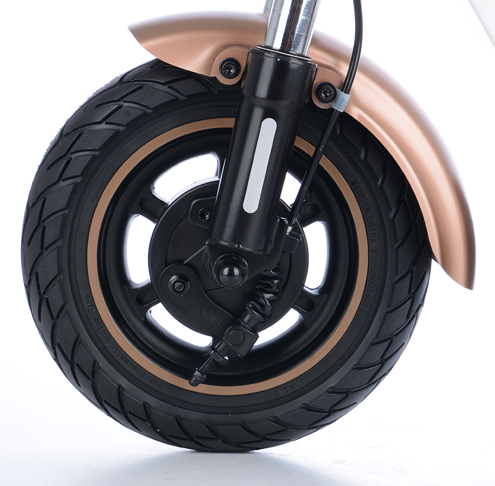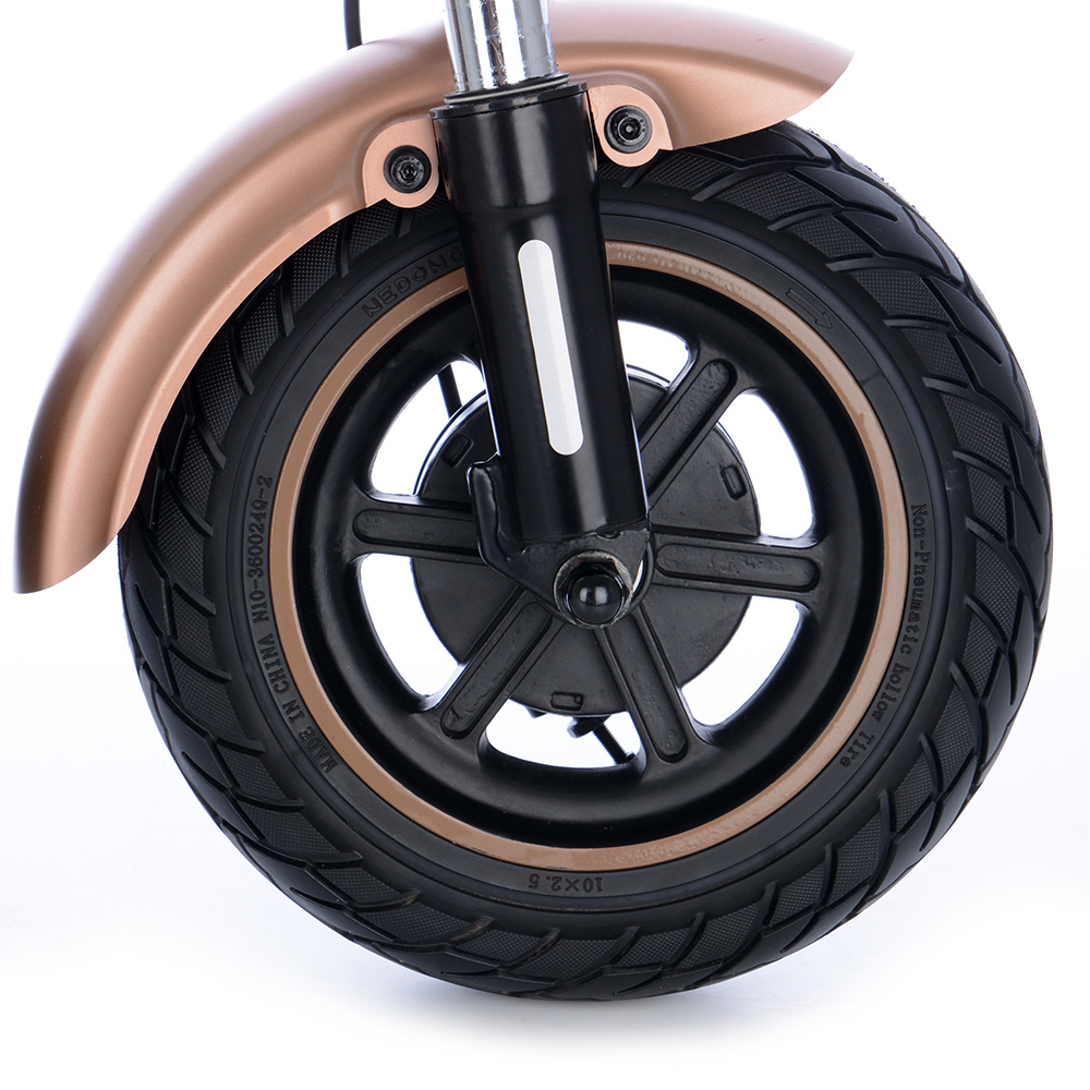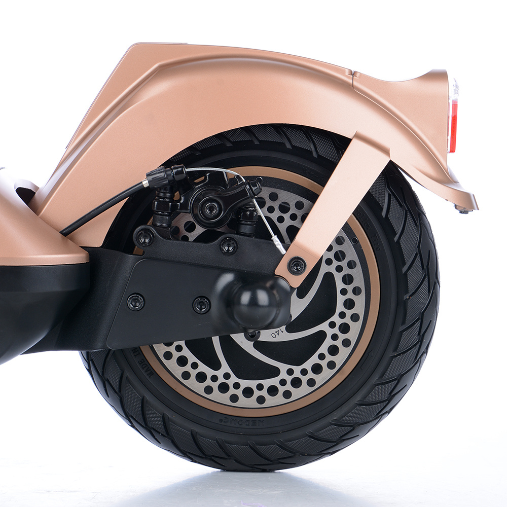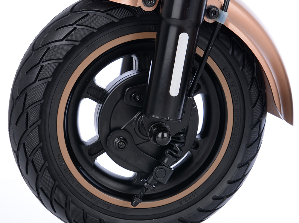 Bezstarostnou jízdu zajišťují 10x2,5“ bezdušové pneumatiky, které nikdy nepropíchnete a překonávání překážek je snadnější díky jejich velkému průměru. Stabilitě na vozovce pomáhá i větší šířka pneumatiky. Přední i zadní vidlice jsou odpružené pro pohodlnou jízdu i po nerovném povrchu. Zadní blatník je vyztužen pro eliminaci únavového zlomu a nepříjemného zvuku při přejíždění nerovností.