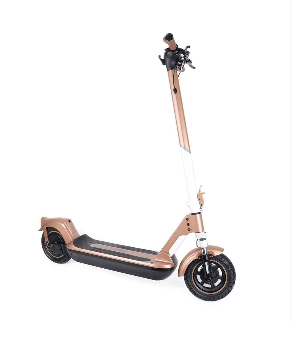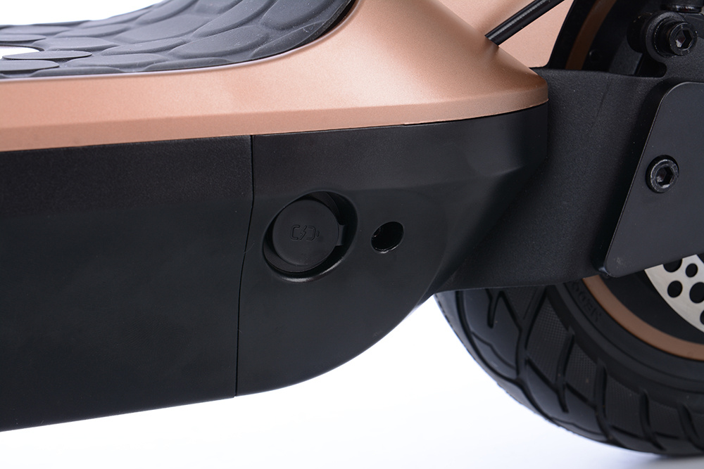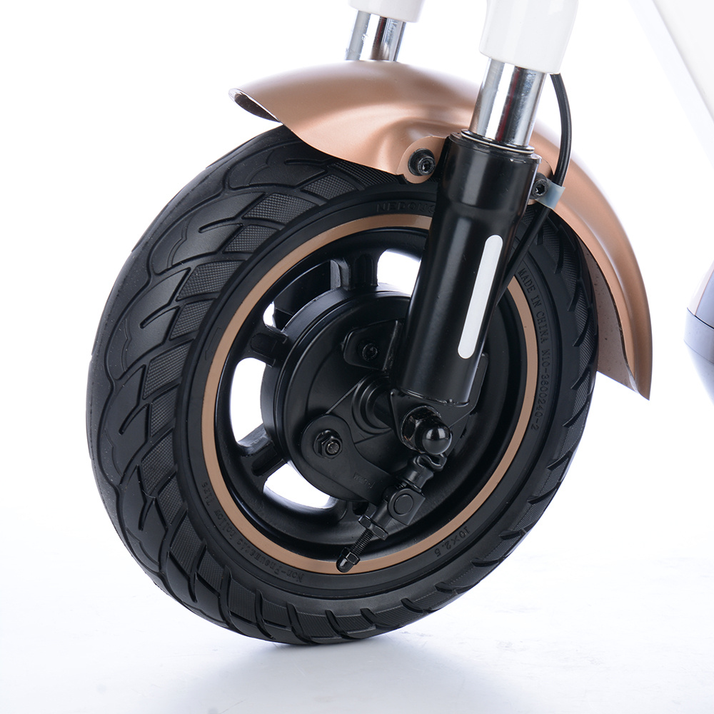 Bezstarostnou jízdu zajišťují 10x2,5“ bezdušové pneumatiky, které nikdy nepropíchnete a překonávání překážek je snadnější díky jejich velkému průměru. Stabilitě na vozovce pomáhá i větší šířka pneumatiky. Přední i zadní vidlice jsou odpružené pro pohodlnou jízdu i po nerovném povrchu. Zadní blatník je vyztužen pro eliminaci únavového zlomu a nepříjemného zvuku při přejíždění nerovností.