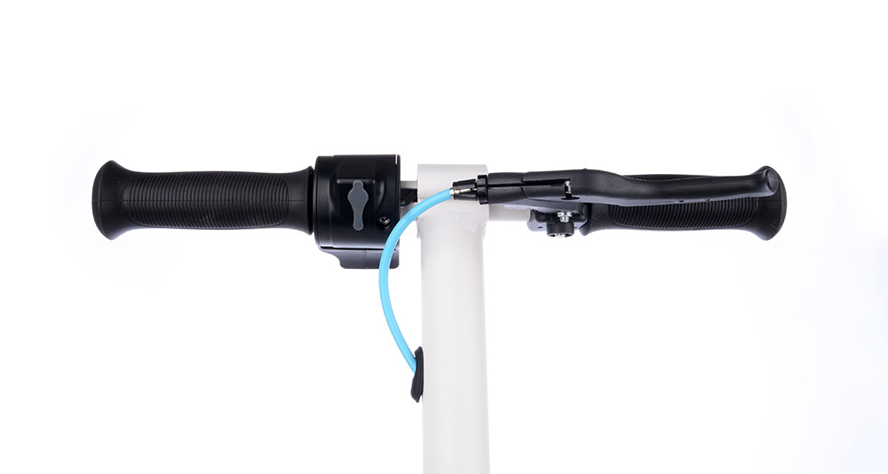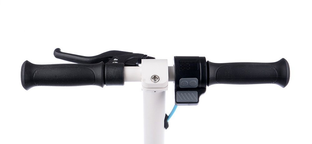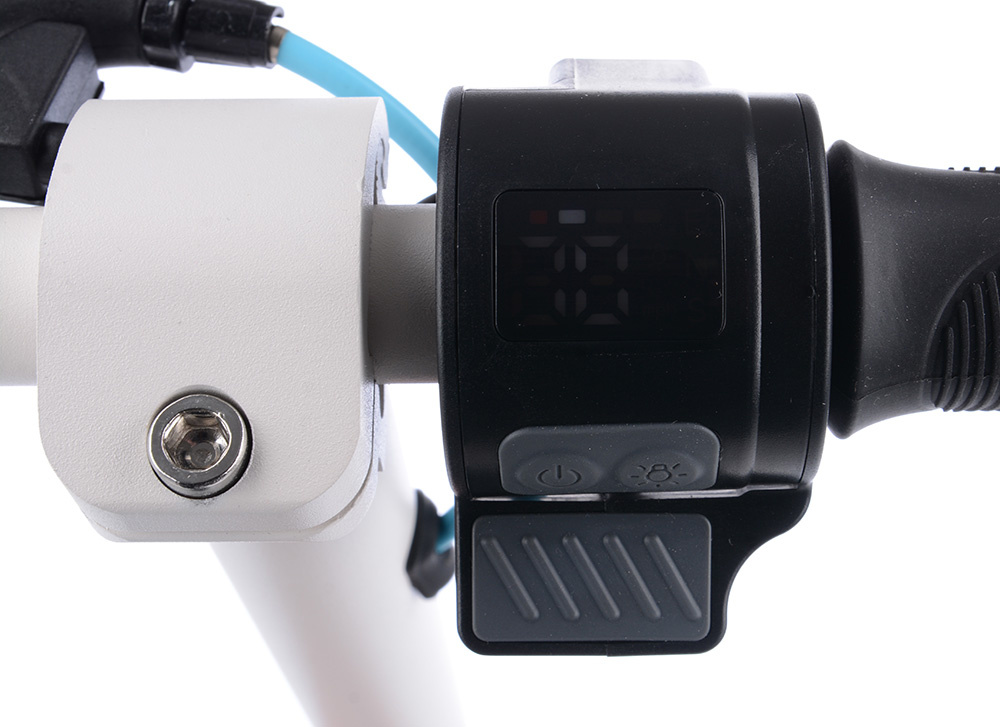 E-koloběžka je vybavena ovládacím panelem s barevným displejem a akcelerátorem na řídítkách.