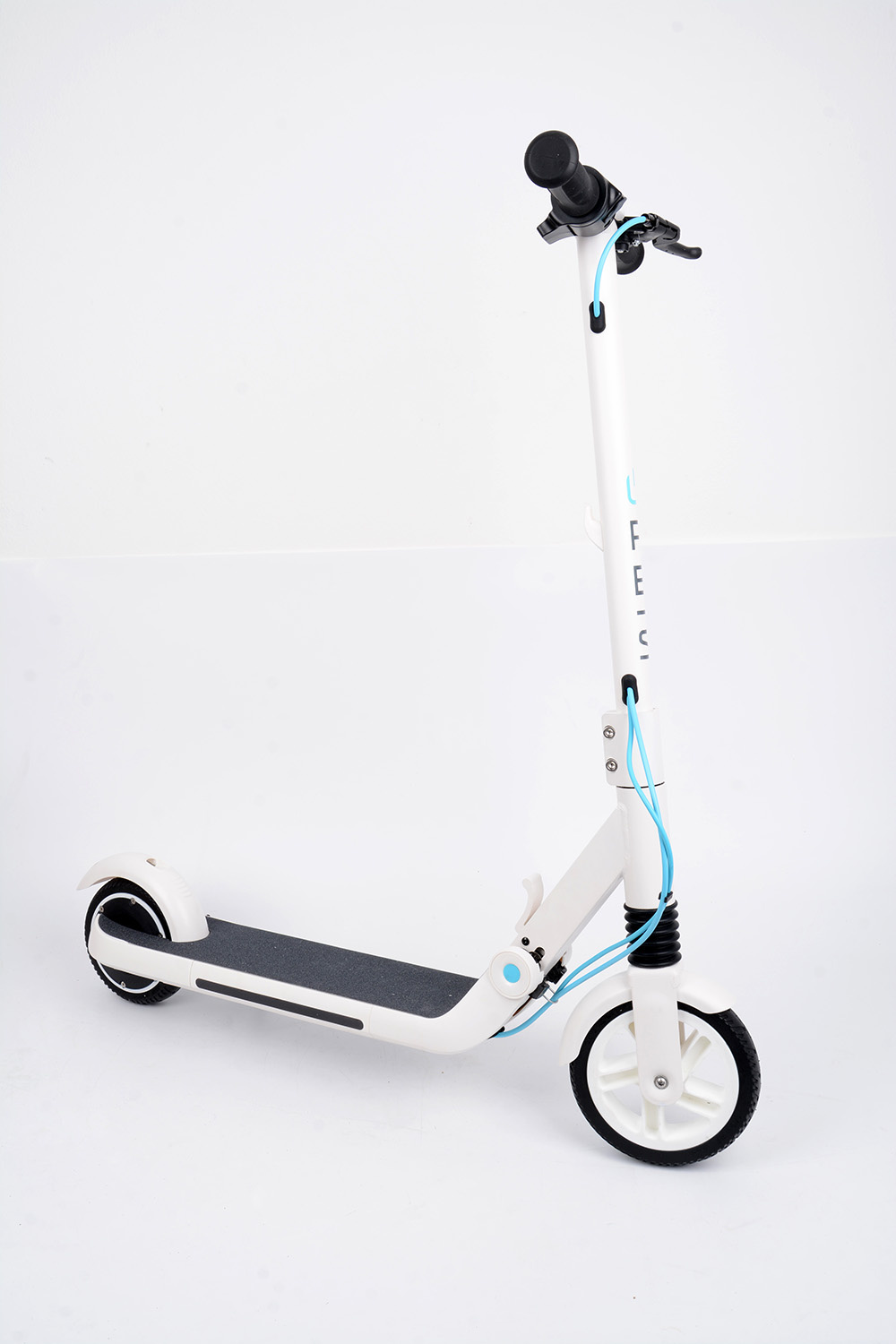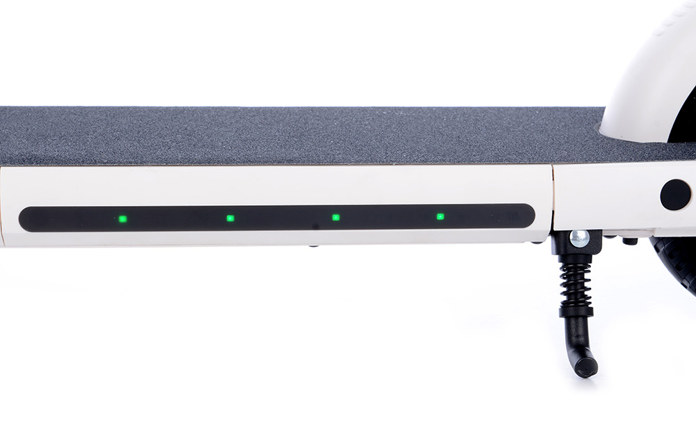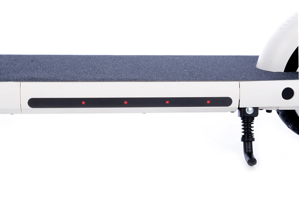 Stylová dětská elektrická koloběžka s výkonným 150 W motorem. Díky kapacitě baterie 2,5 Ah činí dojezd cca 10 km (záleží na povětrnostních podmínkách, hmotnosti jezdce, kvalitě povrchu apod.). Na řídítkách se nachází páčka přítlačné a současně i elektrické brzdy. Aby bylo brzdění ještě efektivnější, zadní blatník slouží také jako nášlapná brzda, tzn., že e-koloběžka je osazena 3 brzdovými systémy. Na desce se nachází výklopný stojánek.