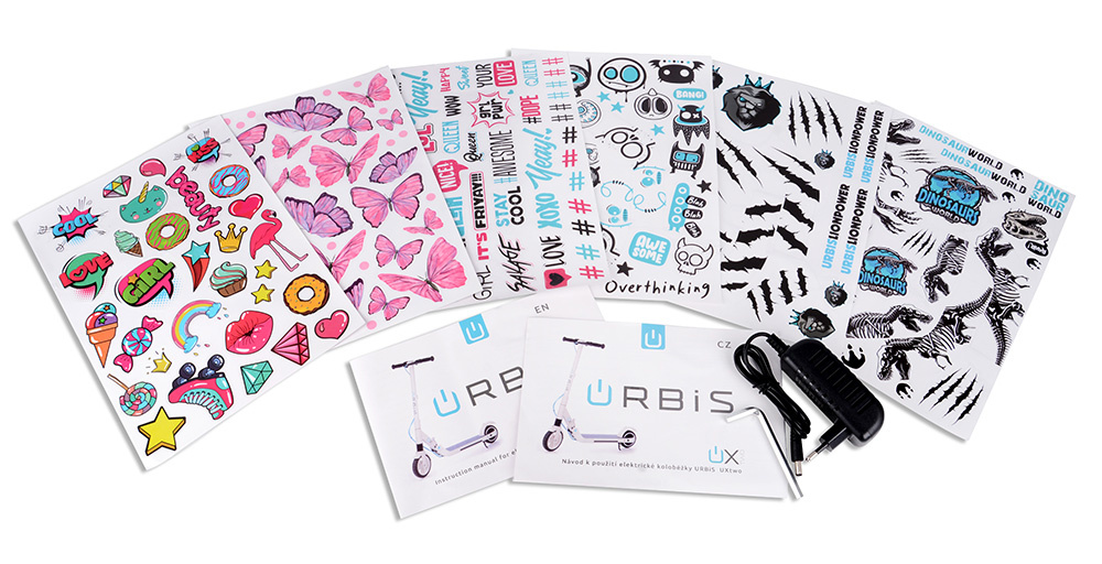 V balení se nachází 6 archů o velikosti A4 s nálepkami speciálně designovanými pro tento model, aby si mohl každý uživatel e-koloběžku stylizovat a individualizovat.