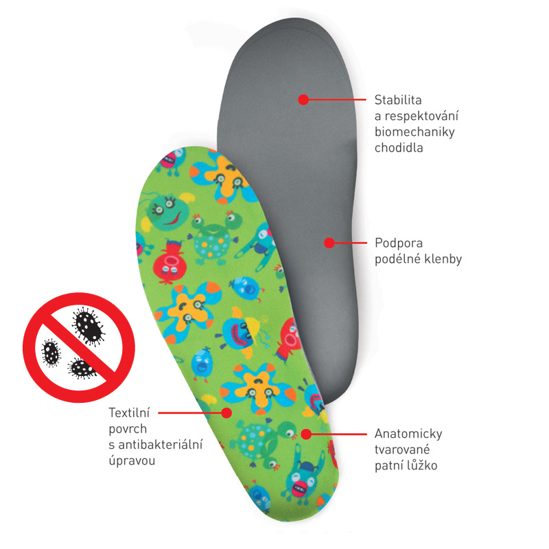 vložky mají antibakteriální povrchovou úpravu. Svrchní textilní úplet obsahuje nanočástice stříbra, které zabraňují šíření bakterií a tvorbě zápachu.