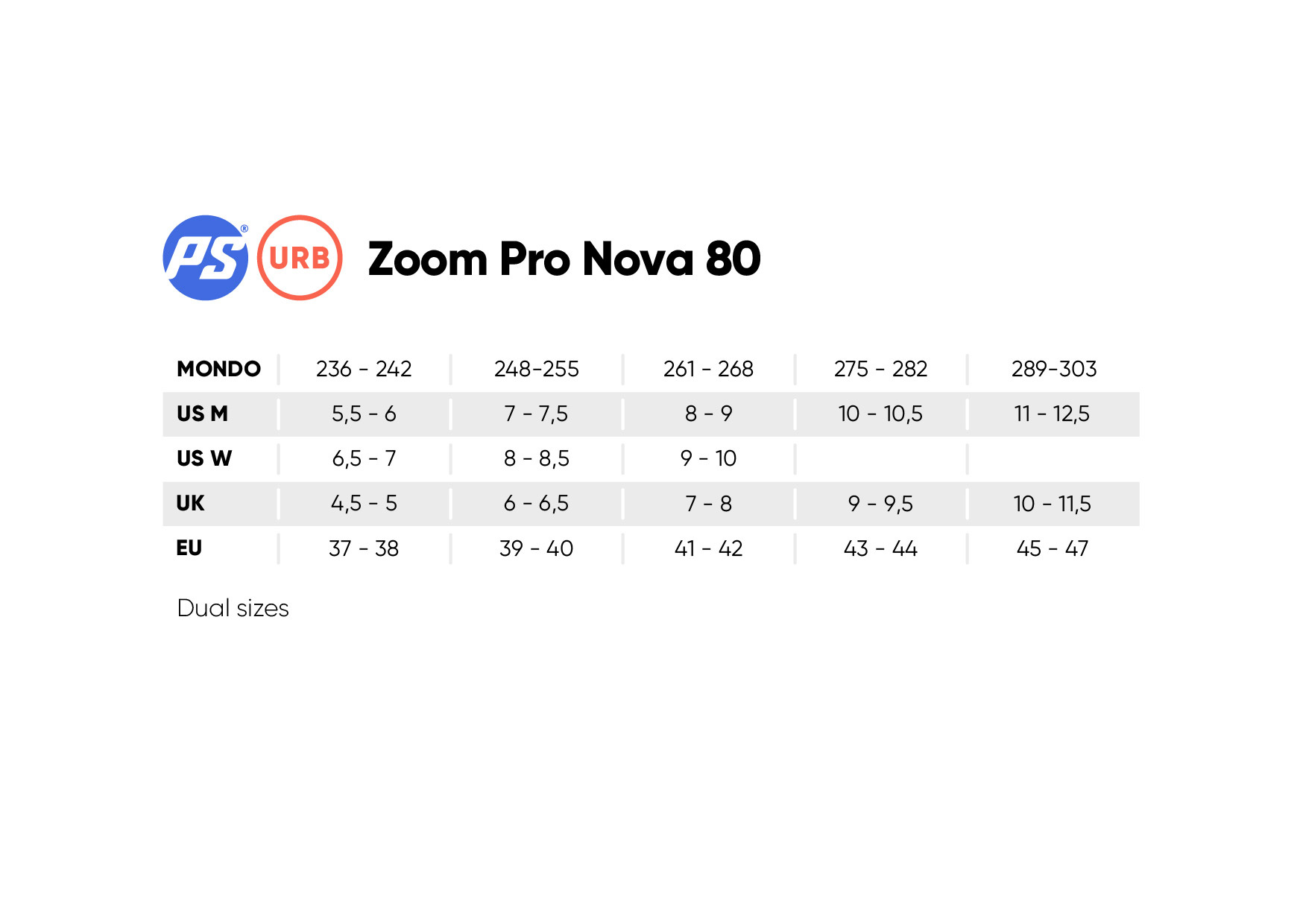 Pro větší velikosti začínající od 43/44 je Zoom Pro Nova 80 vybaven 275mm/4x90 Nova rámem, který umožňuje upgradovat na 90mm setup. S 1mm přirozeným rockeringem je 275mm Nova rám ideální pro Wizard skating, což otevírá nekonečné možnosti pro kreativní a vzrušující pohyby. brusle jsou vybaveny koly Spinner 80mm / 88A a ložisky Wicked ABEC 9, což zajišťuje plynulou a rychlou jízdu. Ať už bruslíte městem nebo se vydáváte na městské překážky, tyto kvalitní komponenty vám zajistí vzrušující a příjemný zážitek.