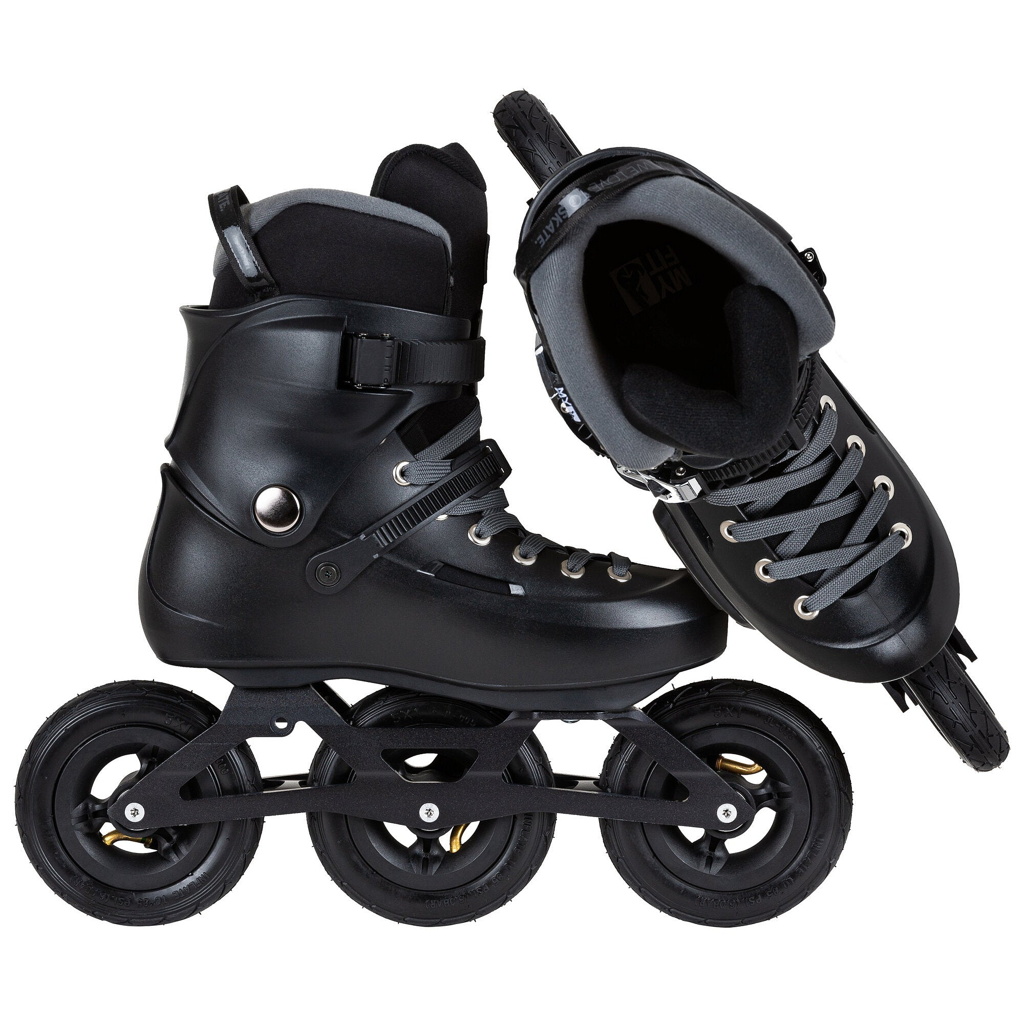 Robustní bota je vybavena propracovaným systémem zapínání, který zahrnuje pevnou přezku na manžetě, tradiční šněrování a 45° ráčnovou přezku, která pevně fixuje patu. Brusle také obsahují silný tlumič nárazů a vložku MYFIT Recall Dual fit s paměťovou pěnou, která poskytuje vynikající odpružení a pohodlí – ideální pro skoky a náročné terénní výzvy.